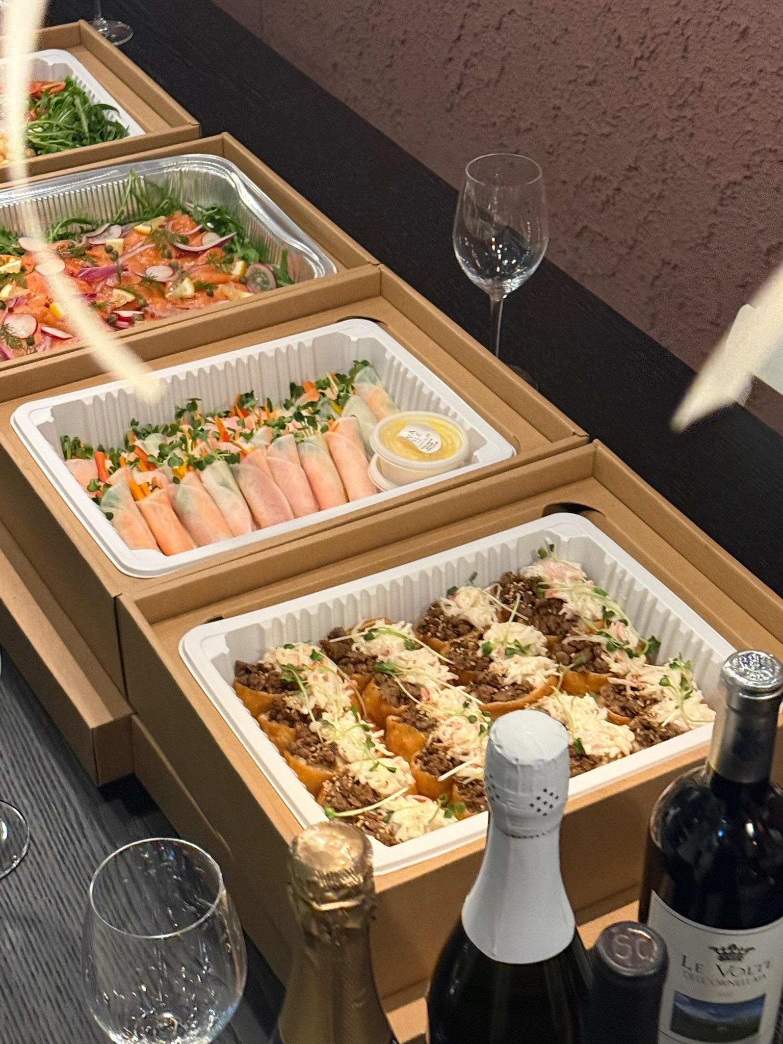 박스에 케이터링된 음식은 진짜 고급져보여요